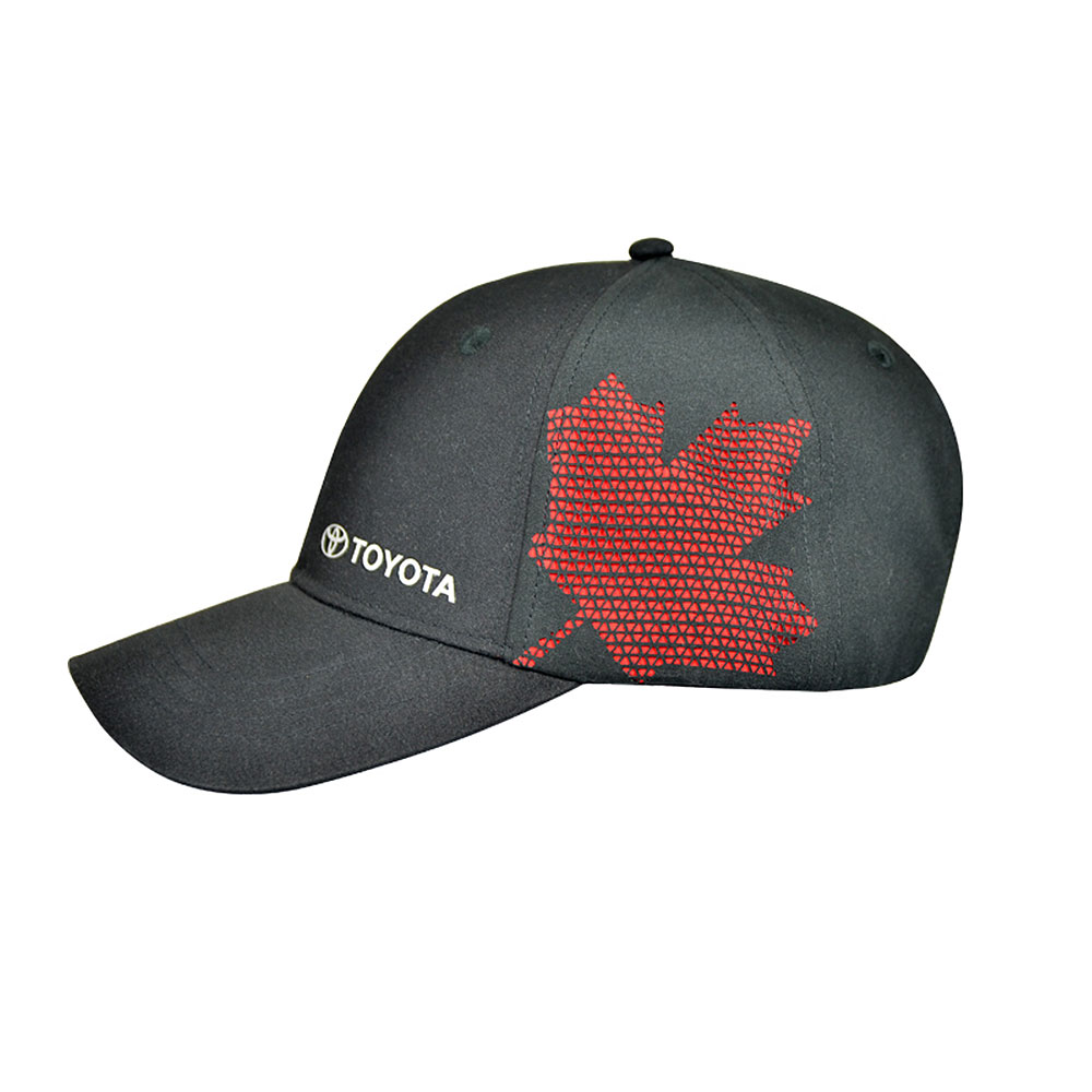 This new Toyota custom cap includes a black stretch twill poly/spandex structure cap with a curved bill. The left side of the cap features a Red Maple Leaf laser cut-out, with the Toyota logo featured on the front of the cap in reflective print. Embossed logo on metal buckle closure.