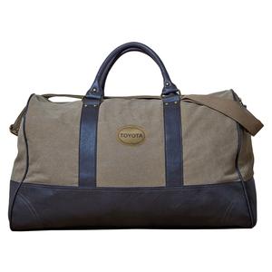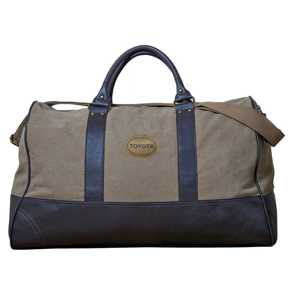 Cotton canvas executive duffel bag with synthetic leather straps and base. Stylish plaid cotton lining, interior zippered pockets, adjustable and detachable shoulder strap and antique brass hardware. Convenient brass feet to protect bottom of bag. Exterior zippered pocket.